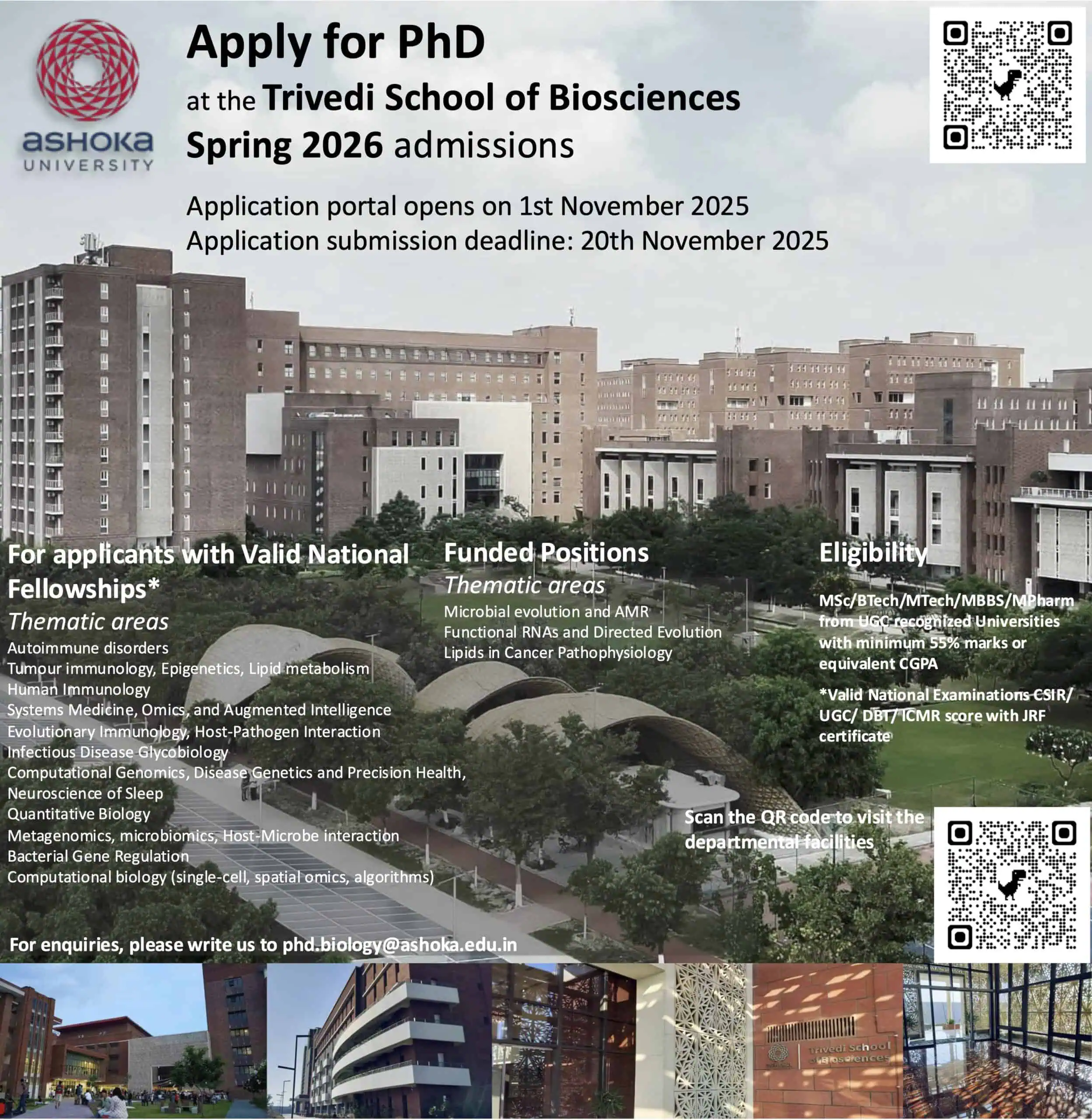 The Department of Biology at Ashoka University invites students to carry out cutting-edge research through its Ph.D. program in Biological Sciences. We are recruiting Ph.D. candidates for the academic session, spring semester 2026, in the following thematic areas (Only for candidates with valid national fellowship scores):