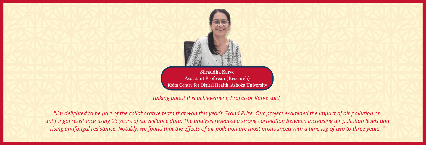 Talking about this achievement, Professor Karve said, “I’m delighted to be part of the collaborative team that won this year’s Grand Prize. Our project examined the impact of air pollution on antifungal resistance using 23 years of surveillance data. The analysis revealed a strong correlation between increasing air pollution levels and rising antifungal resistance. Notably, we found that the effects of air pollution are most pronounced with a time lag of two to three years.”