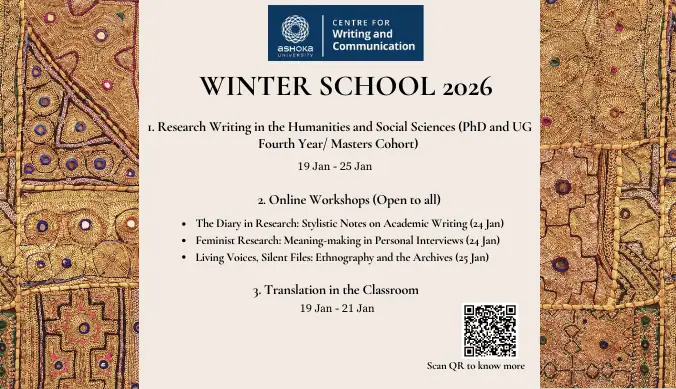 The 2026 edition of the Centre for Writing and Communication Winter School offers a diverse range of workshops and sessions on research writing and communication within the liberal arts academy. The primary offering is its annual in-person school on Research Writing in the Humanities and Social Sciences for research students at Ashoka University (UG fourth year, Masters and PhD). Additionally, the school offers introductory workshops on niche areas of research such as The Diary in Research: Stylistic Notes on Academic Writing, Feminist Research: Meaning-making in Personal Interviews, Living Voices, Silent Files: Ethnography and the Archives. This year, CWC is also collaborating with the Ashoka Centre for Translation to offer a school on “Translation in the Classroom”, open to Ashoka University Faculty, Staff and Students.