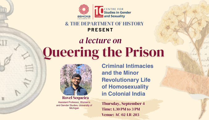 Centre for Studies in Gender and Sexuality and The Department of History, Ashoka University, invite you to a guest lecture by Rovel Sequeira (University of Michigan) on "Queering the Prison: Criminal Intimacies and the Minor Revolutionary Life of Homosexuality in Colonial India".