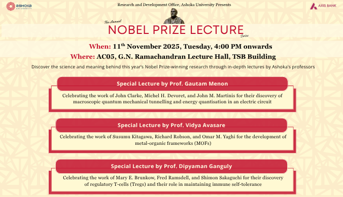 The event will feature lectures by Prof. Gautam Menon on the Nobel Prize in Physics, Prof. Vidya Avasare on the Nobel Prize in Chemistry, and Prof. Dipyaman Ganguly on the Nobel Prize in Physiology or Medicine, explaining the key discoveries and contributions recognised this year.
