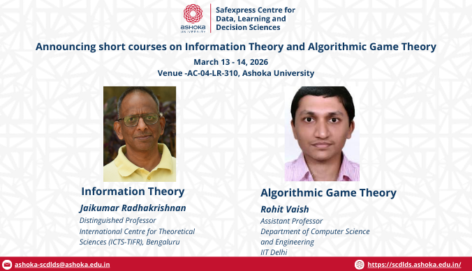 • Rohit Vaish: 10:00 AM – 11:00 AM, 11:30 AM to 12:30 PM (Algorithmic Game Theory)