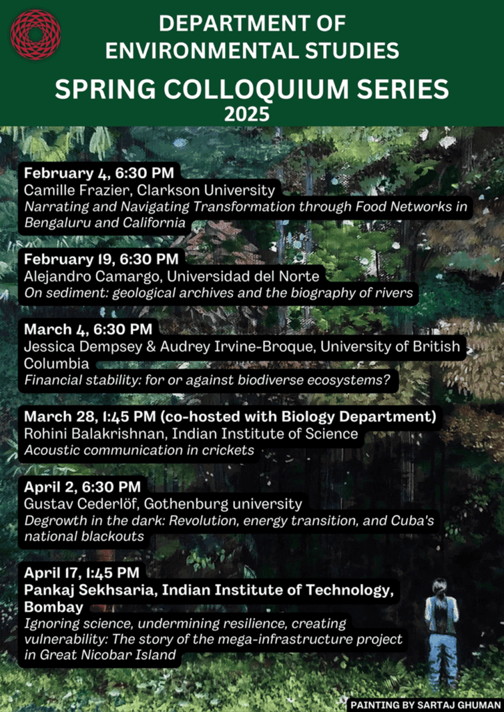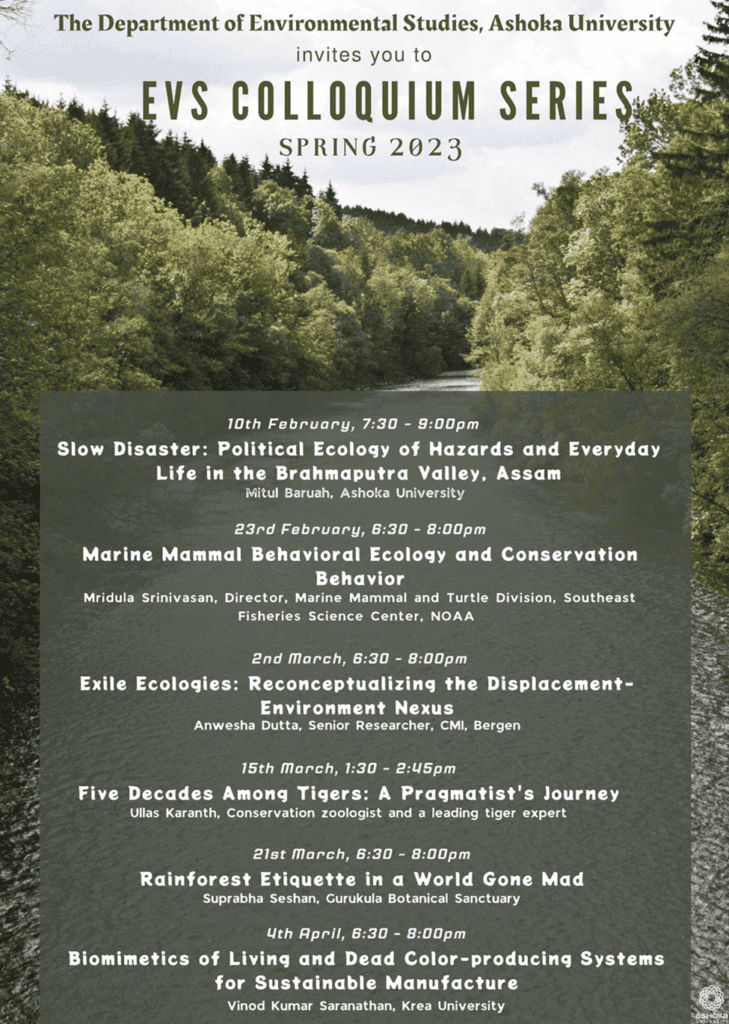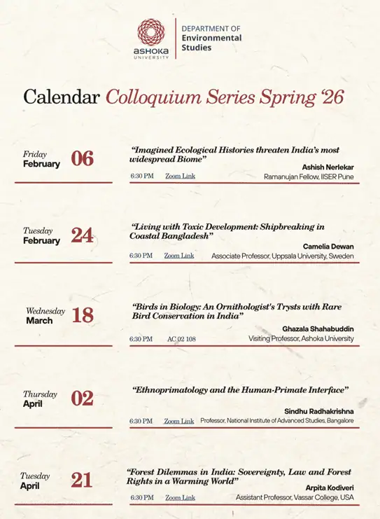 The Environmental Studies Department organised a colloquium series in the Monsoon 2025 semester. The series of lectures explores the intersections of environment, politics, and conservation. The lectures were conducted online as interactive webinars, which had great student engagement.