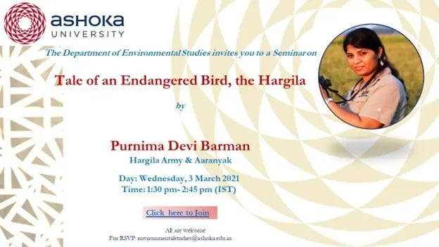 The Environmental Studies Department organized a Seminar on “A Community Conservation Movement: Saving the Endangered Greater Adjutant Stork (Hargila) by Changing Perceptions, Linking to Cultures and Empowering Women in Assam, India” by Purnima Devi Barman, Hargila Army & Aaranyak to be held on Wednesday, 3 March 2021, 1.30-2.45 pm (IST).