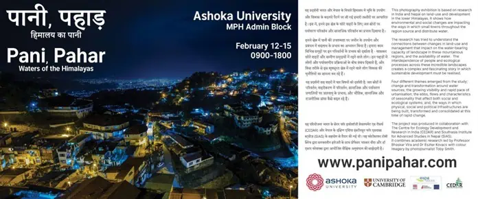 The Environmental Studies Department organized an excellent photo exhibition, “Pani, Pahar: Waters of the Himalayas” from February 13-15, 2019. This exhibition combined academic research led by Prof. Bhaskar Vira and Dr. Eszter Kovacs at the Department of Geography, University of Cambridge, with contemporary work by photojournalist Toby Smith. For more on the exhibition, visit their website: https://www.panipahar.com