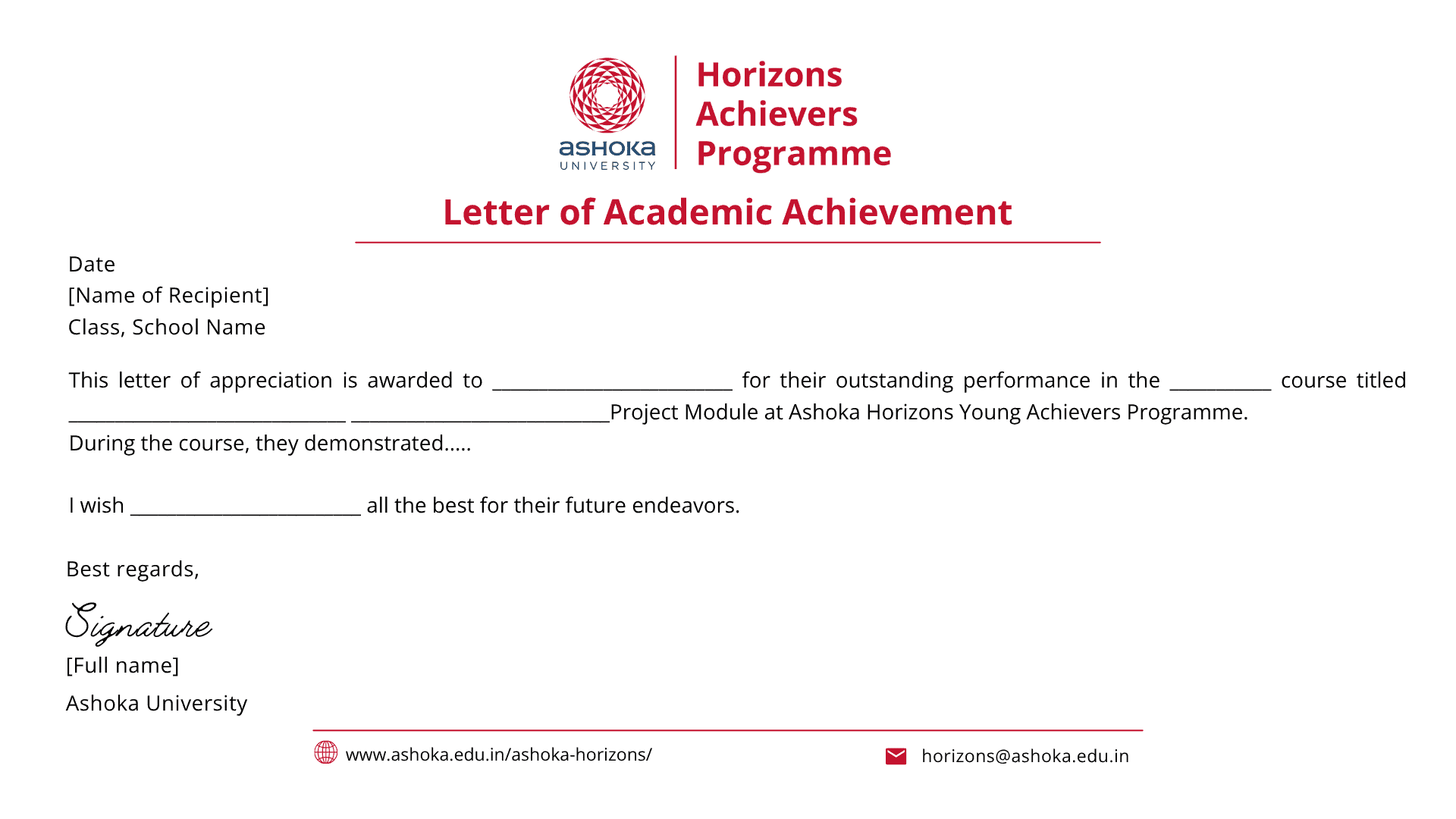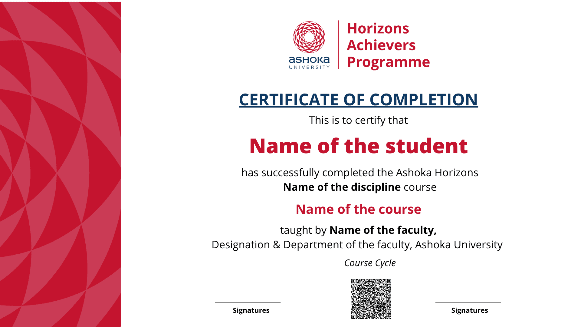 Upon successful completion of Ashoka Horizons Achievers Programme, students receive a digital certificate. This certificate is a valuable addition to their college applications, showcasing their genuine interest and passion for the subject. To earn this certificate, students must maintain a minimum of 75% attendance, complete all required coursework, and submit the capstone project, ensuring a comprehensive understanding and active engagement with the material.