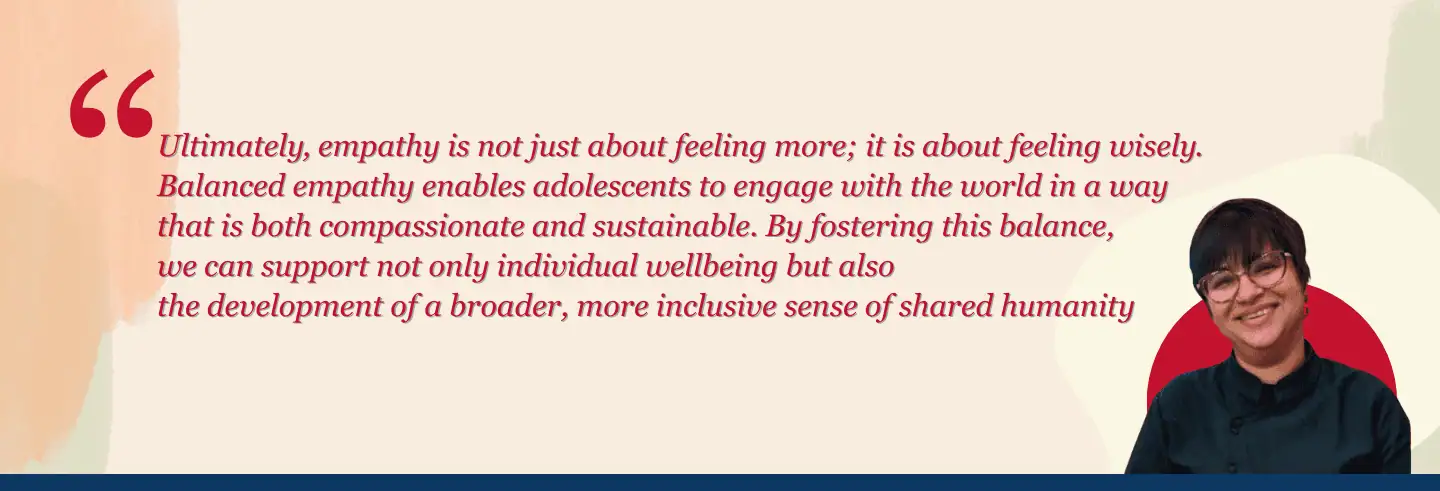Concluding her recent study, Professor Singh notes, “ultimately, empathy is not just about feeling more; it is about feeling wisely. Balanced empathy enables adolescents to engage with the world in a way that is both compassionate and sustainable. By fostering this balance, we can support not only individual wellbeing but also the development of a broader, more inclusive sense of shared humanity”.