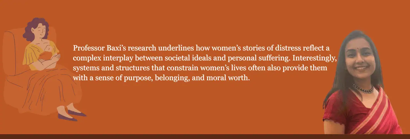 Reflecting upon her research journey and observations in the given field, Professor Baxi says, “As a psychologist, academic, mental health practitioner, and most importantly as a woman, I have witnessed how women’s stories of distress reflect a complex interplay between societal ideals and personal suffering. Systems and structures that constrain women’s lives often also provide them with a sense of purpose, belonging, and moral worth.”