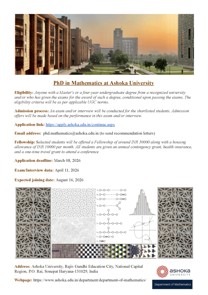 The Department of Mathematics at Ashoka University is currently inviting applications for its Ph.D. program. The research areas covered by the department are described in more detail in the faculty profile pages.