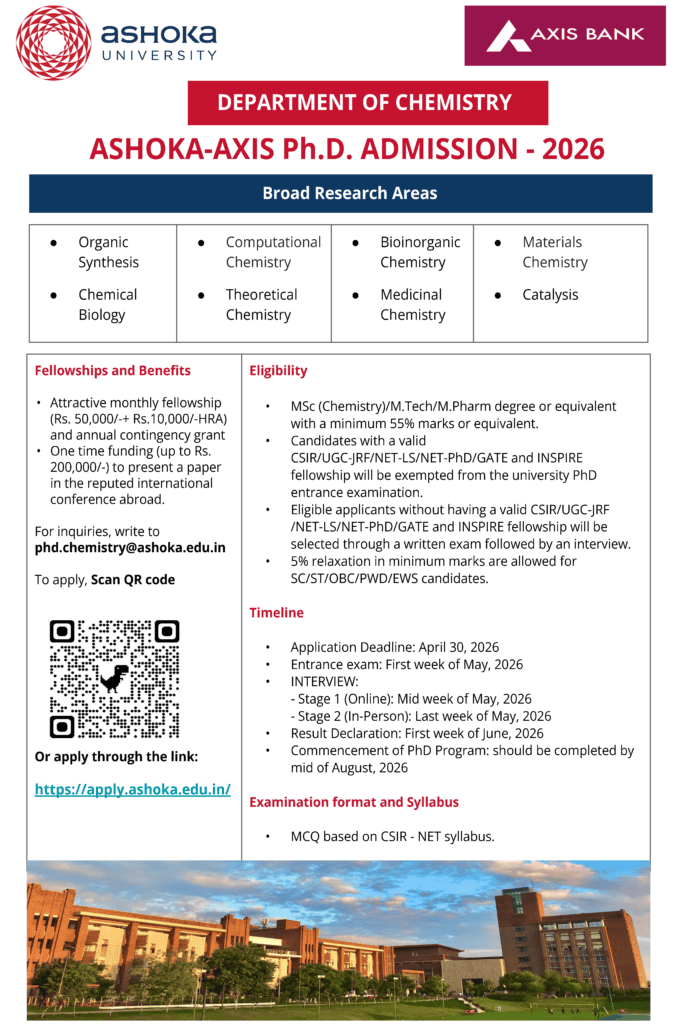 Qualifying national examination is most preferrable for applying Ph.D. in Chemistry in Ashoka University. However, you can always apply, and Ashoka University will provide the full funding (equivalent to national fellowship) for Ph.D. students for 5 years