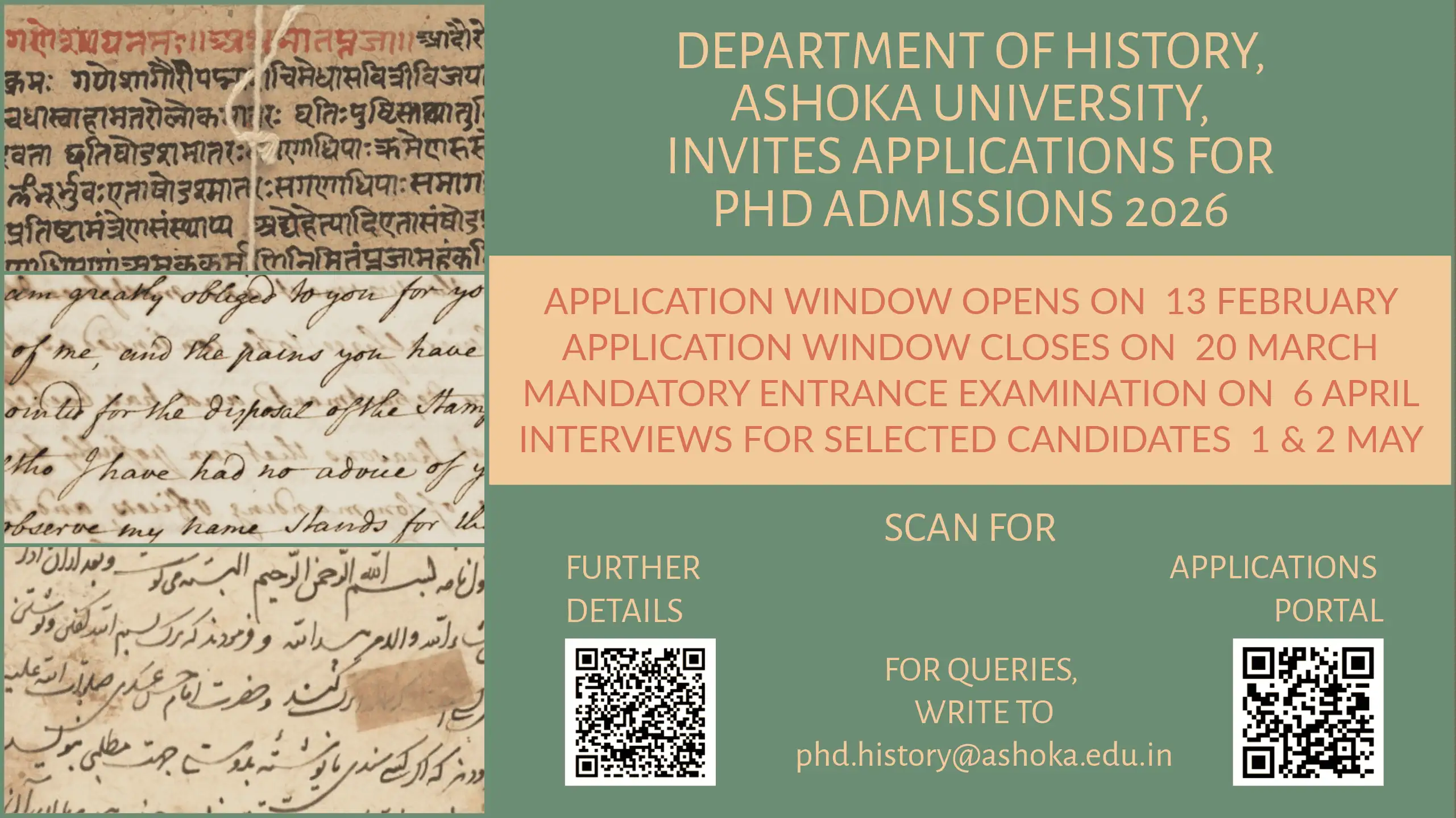 All queries related to the Ph.D. application and admission process should be directed to phd.history@ashoka.edu.in