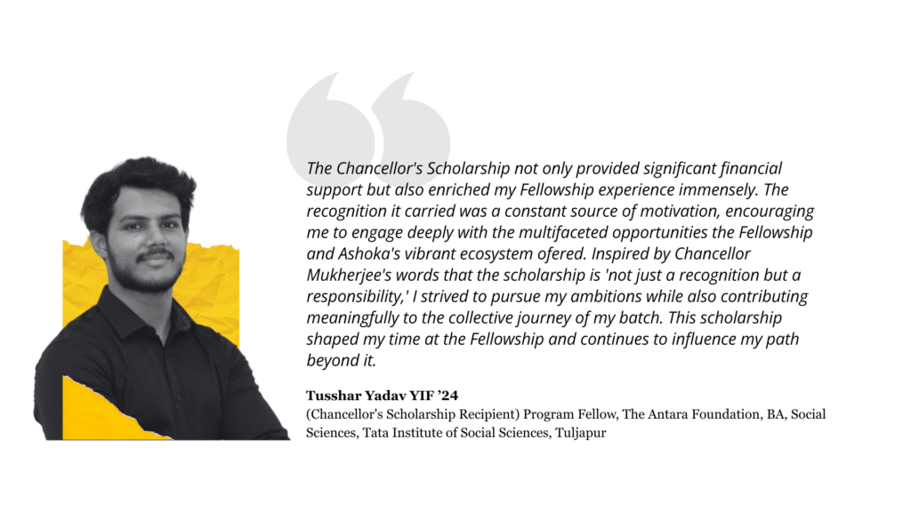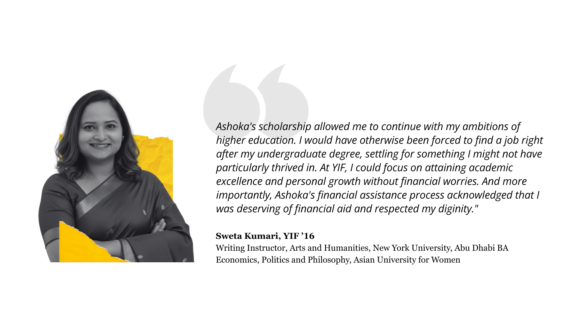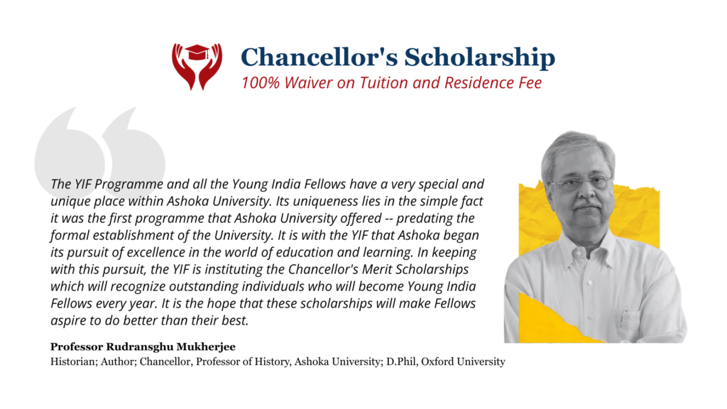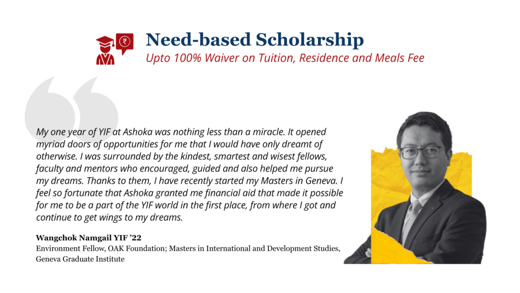 Ashoka University’s need-based scholarship programme aims to provide the necessary financial support which can help you bridge the gap between the cost of the programme and your ability to pay. Several benefactors, including YIF alumni, have made need-based scholarships possible. Before awarding need-based scholarships to Fellows, we expect that the Fellow and/or their family/guardian(s) will consider various resources available to them towards financing the cost of the YIF programme.